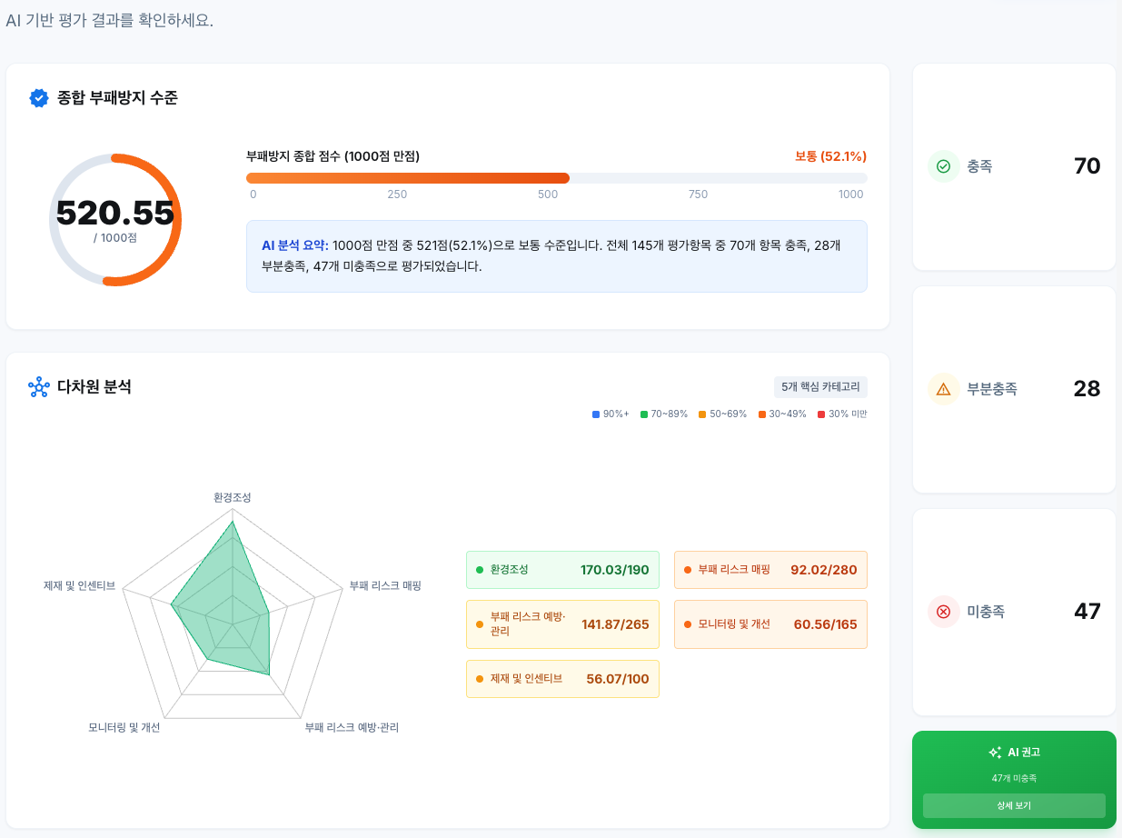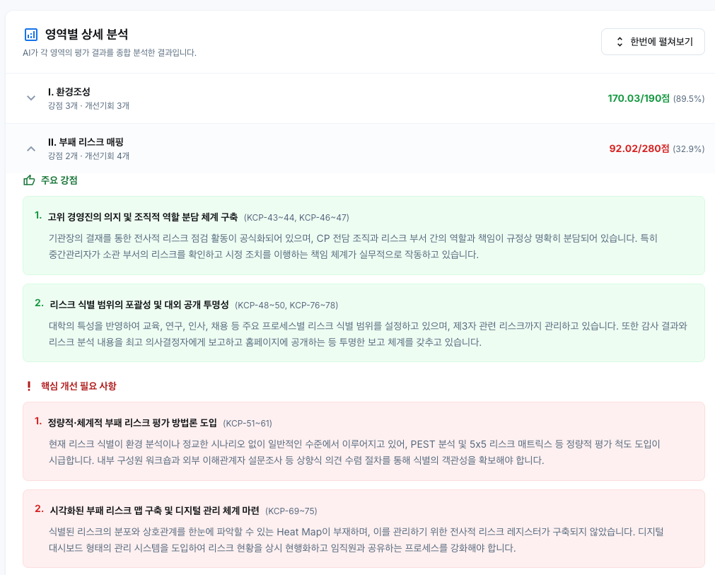 평가 영역별로 강점, 약점, 개선사항을 상세 분석합니다. 단순 점수가 아닌, 실제 가능한 개선 방향을 제시하여 실질적인 컴플라이언스 역량 강화를 돕습니다.