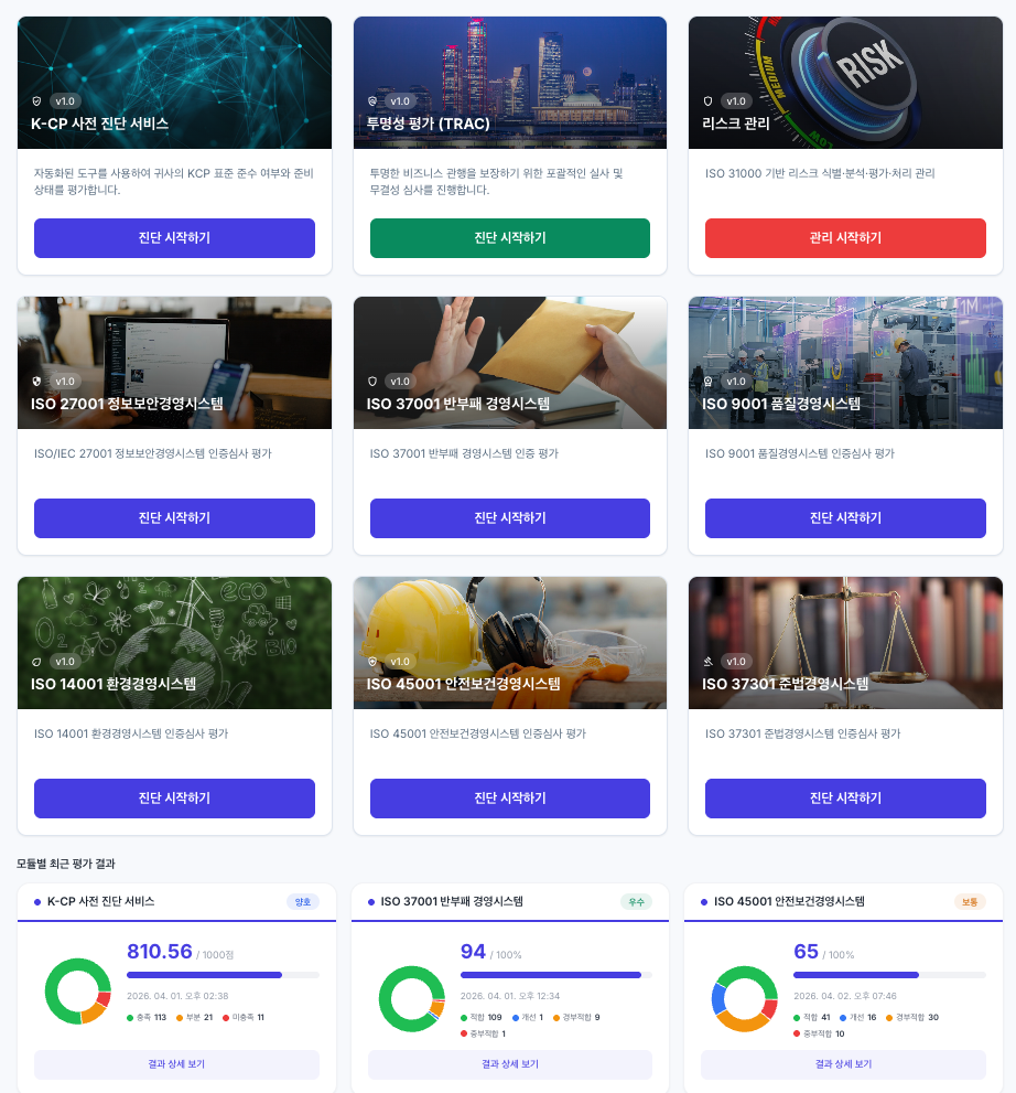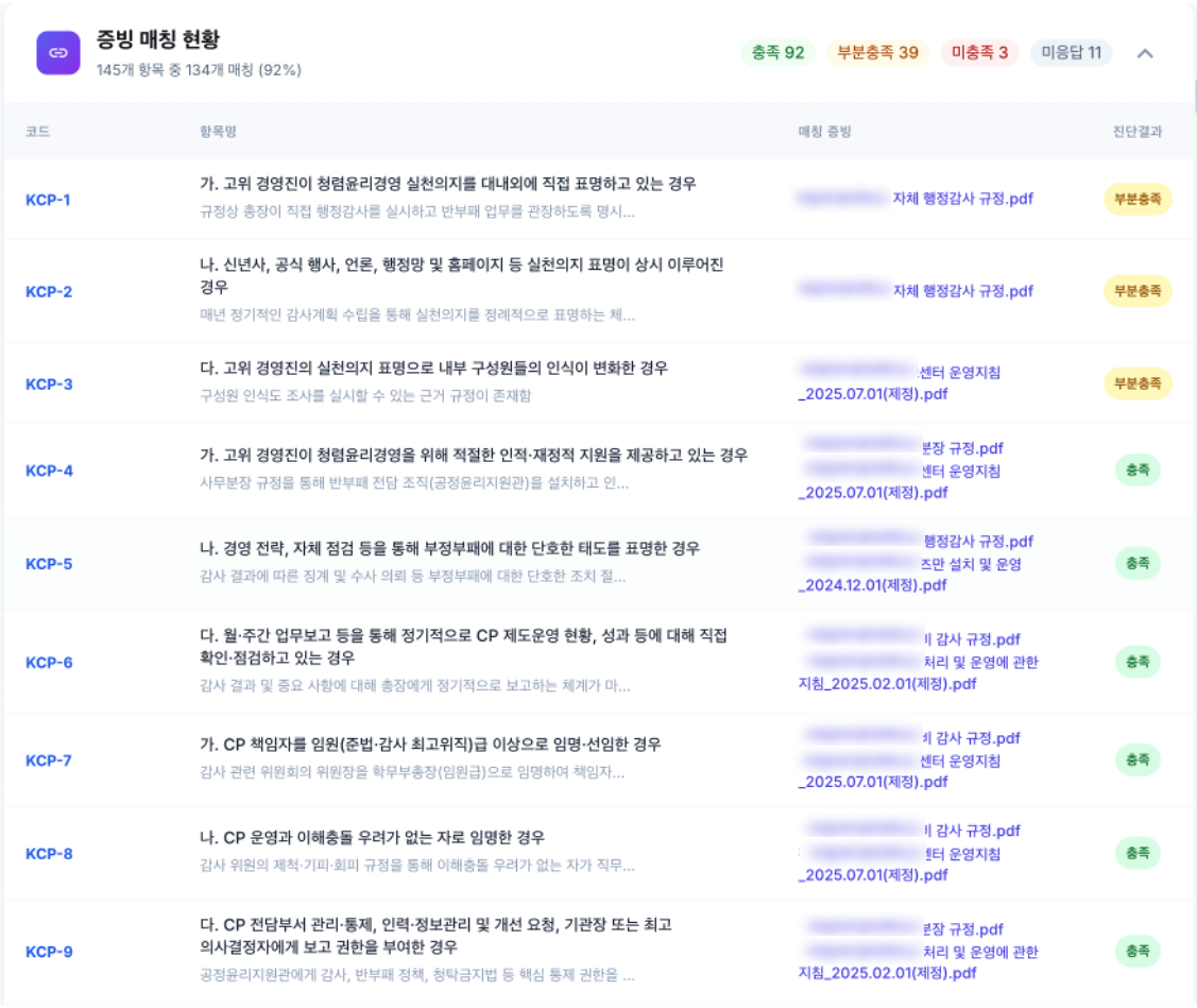증빙 자료를 업로드하면 AI가 K-CP(국민권익위원회), TRAC(국제투명성기구), ISO 37001 등 컴플라이언스 기준에 따라 자동으로 평가합니다. 수백 개의 평가 항목도 몇 분 안에 완료됩니다.