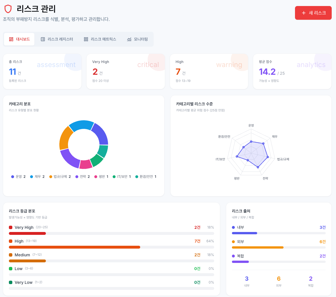리스크 등록부, 리스크 매트릭스, 모니터링 대시보드를 통해 조직의 컴플라이언스 리스크를 체계적으로 관리합니다. 리스크 등록부에서 대응 조치까지 하나의 흐름으로 관리됩니다.
