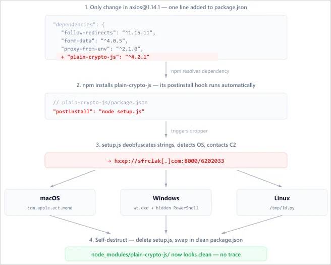 package.json파일에plain-crypto-js@^4.2.1라는 악성 종속성(Dependency)을 추가하는 방식을 썼습니다. - 크로스 플랫폼 타격: 패키지가 설치될 때 악성 스크립트가 실행되며, 사용자의 운영체제(OS)를 파악해 맞춤형 공격을 진행합니다.